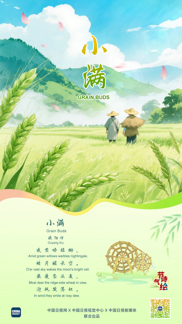At Grain Buds, wheat kernels plump up but remain unripe, signaling an early stage of fullness. Northern Song Dynasty (960-1127) poet Ouyang Xiu wrote in his poem Grain Buds: Most dear the ridge-side wheat in view; In wind they smile at rosy dew. Grain Buds encapsulates "full, yet not overflowing", and only thus does balance hold.