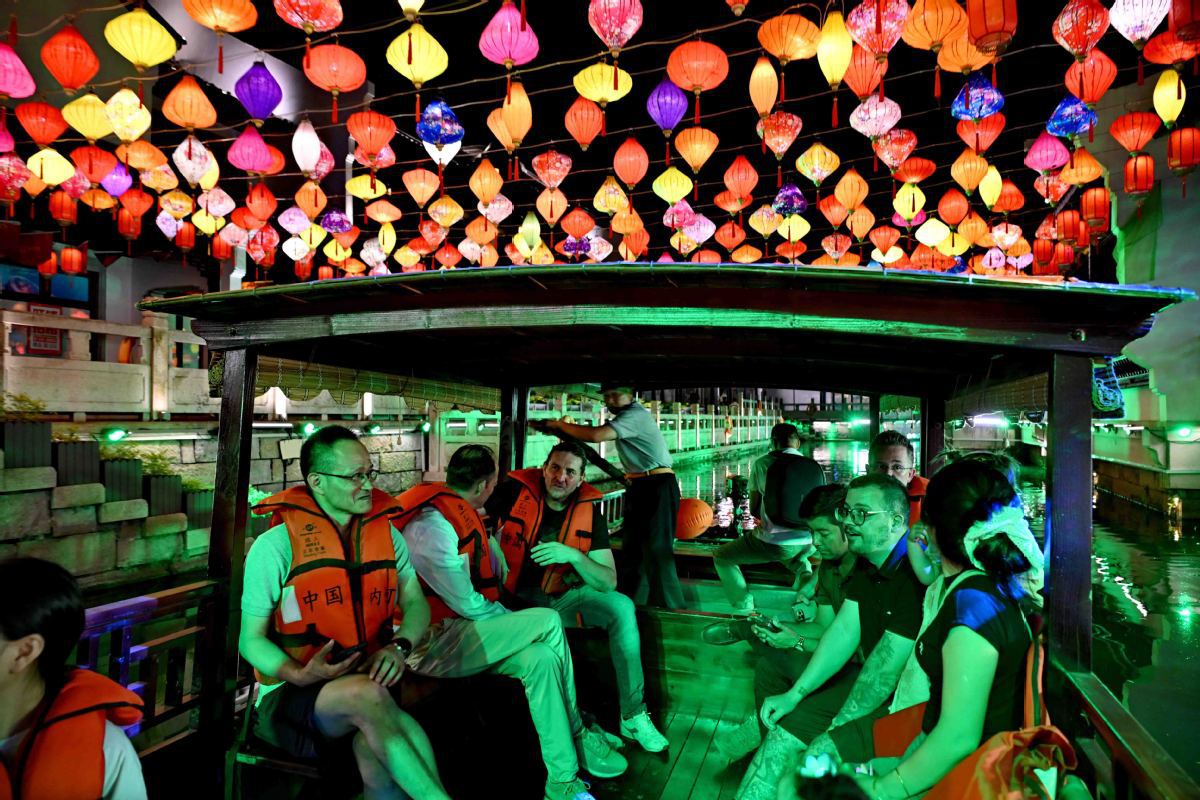 International visitors glide through Yueli Ancient Town's night on a lantern-lit boat. [Provided to chinadaily.com.cn]