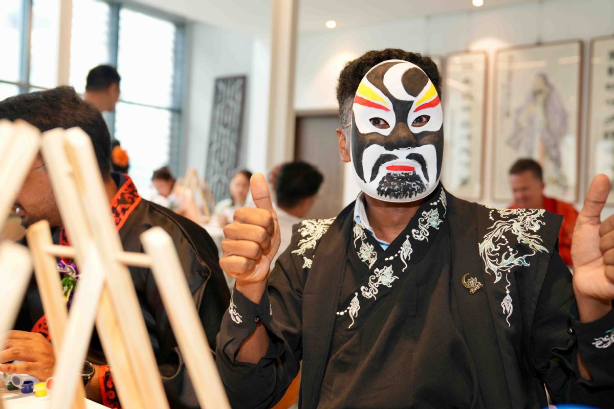 Nalantha, a visitor from Sri Lanka, tries on a Sino-Sri Lankan hybrid theatrical mask. [Provided to chinadaily.com.cn]