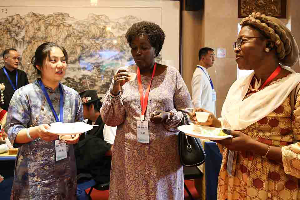 Faith Bett (middle), wife of Kenyan ambassador to China, and Awa Bitie (right), wife of Burkina Faso ambassador to China, taste Chinese tea during an event marking the International Tea Day in Beijing on May 21. [Photo by Wu Xiaohui/chinadaily.com.cn]