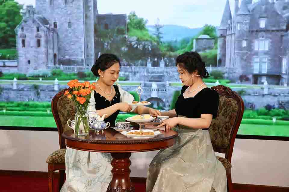 A "fusion" English afternoon tea performance that includes Chinese tea and Chinese cakes is presented during an event marking the International Tea Day in Beijing on May 21. [Photo by Wu Xiaohui/chinadaily.com.cn]