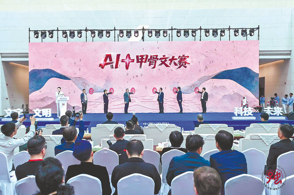 A competition to promote AI-assisted research and use of oracle bone script is announced during the 2025 China (Anyang) International Conference of Chinese Characters in Anyang, Henan province, on April 20. [Photo provided to China Daily]