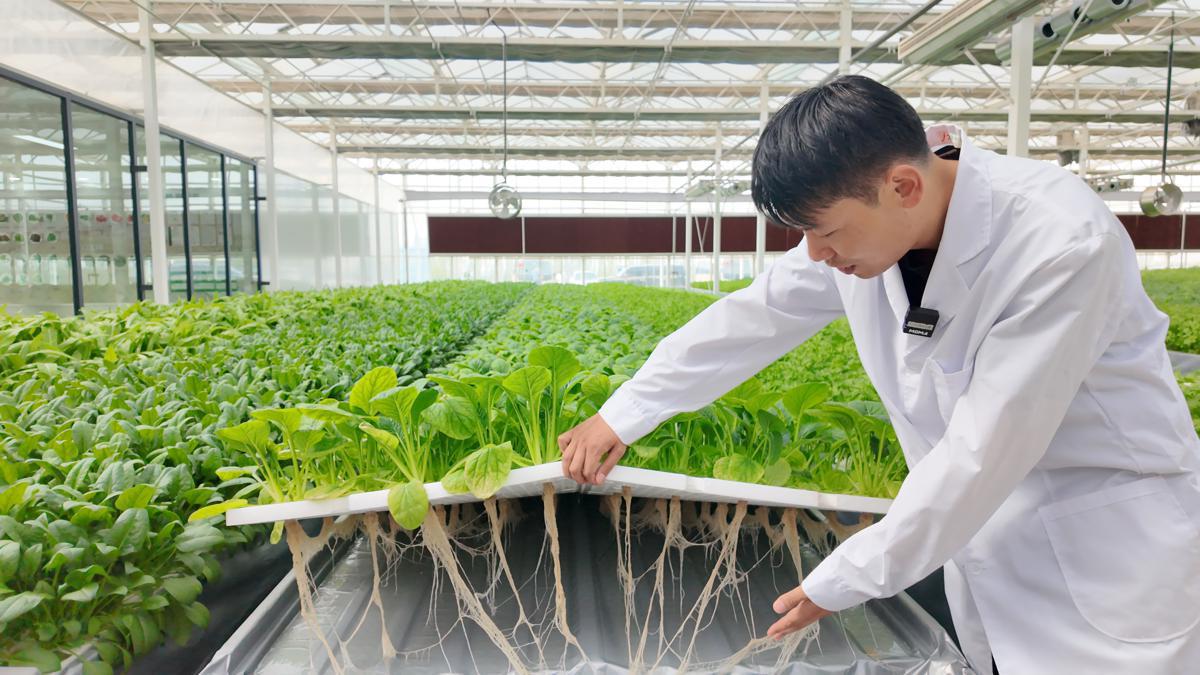 Li Songsong, the technical director at Kuqa Zhenxuan Supply Chain Co, demonstrated how plant roots thrive in oxygenated, nutrient-rich water on May 19. [Photo by Guo Yanqi/for chinadaily.com.cn]