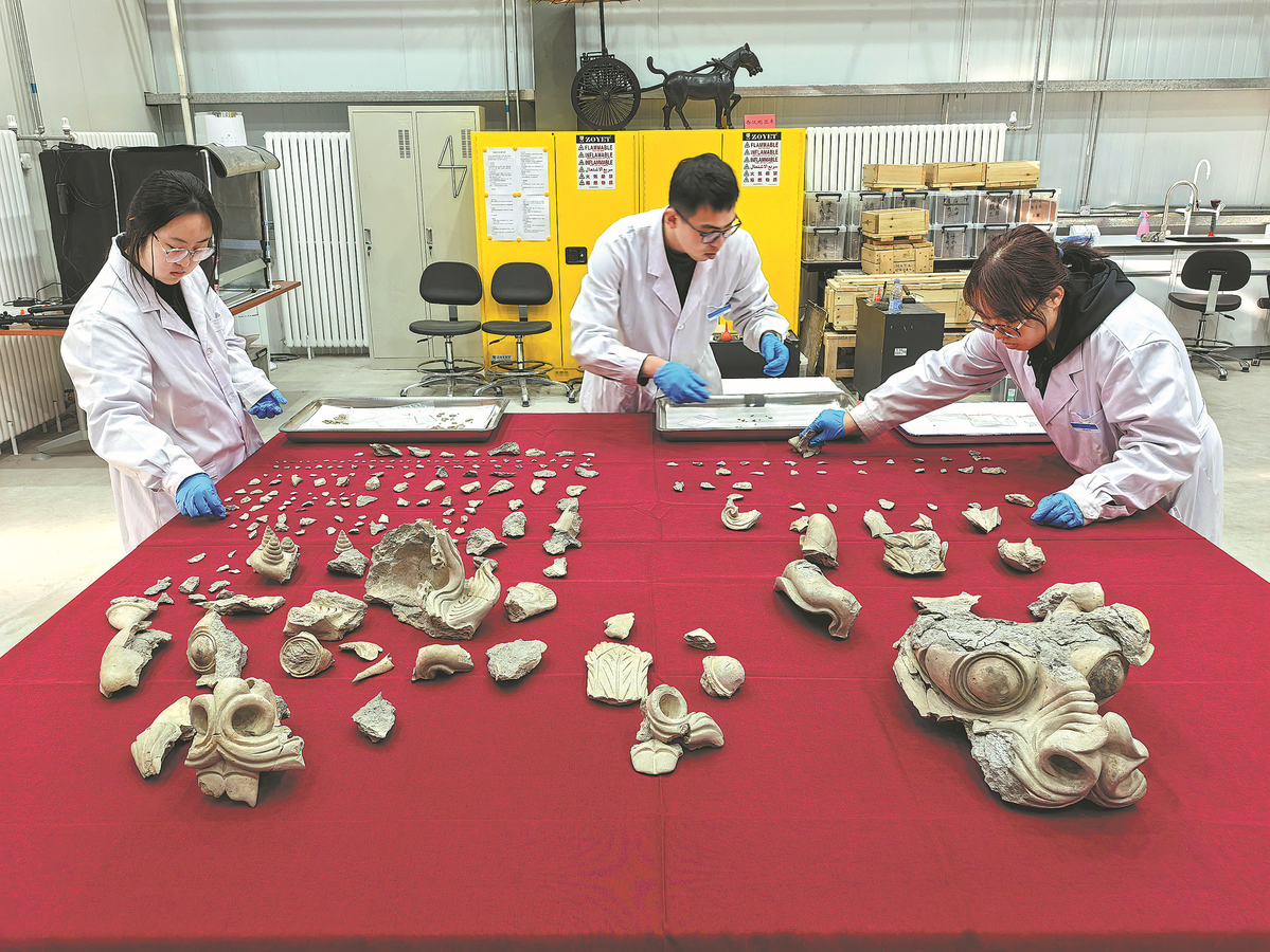 Staff members of the Chinese Academy of Social Sciences' Key Laboratory of Archaeological Sciences and Cultural Heritage restore Tang Dynasty (618-907) pottery dragon heads in April. CHINA DAILY