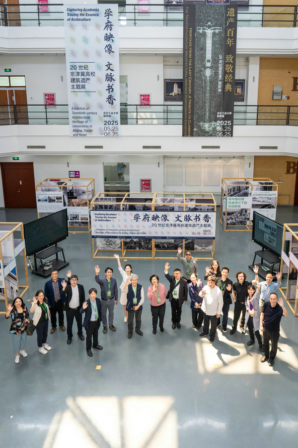 Guests and the curatorial team pose for a group photo at the two exhibitions on 20th-century architectural heritage at the North China University of Technology in Beijing, on May 25, 2025. [Photo provided to chinadaily.com.cn]