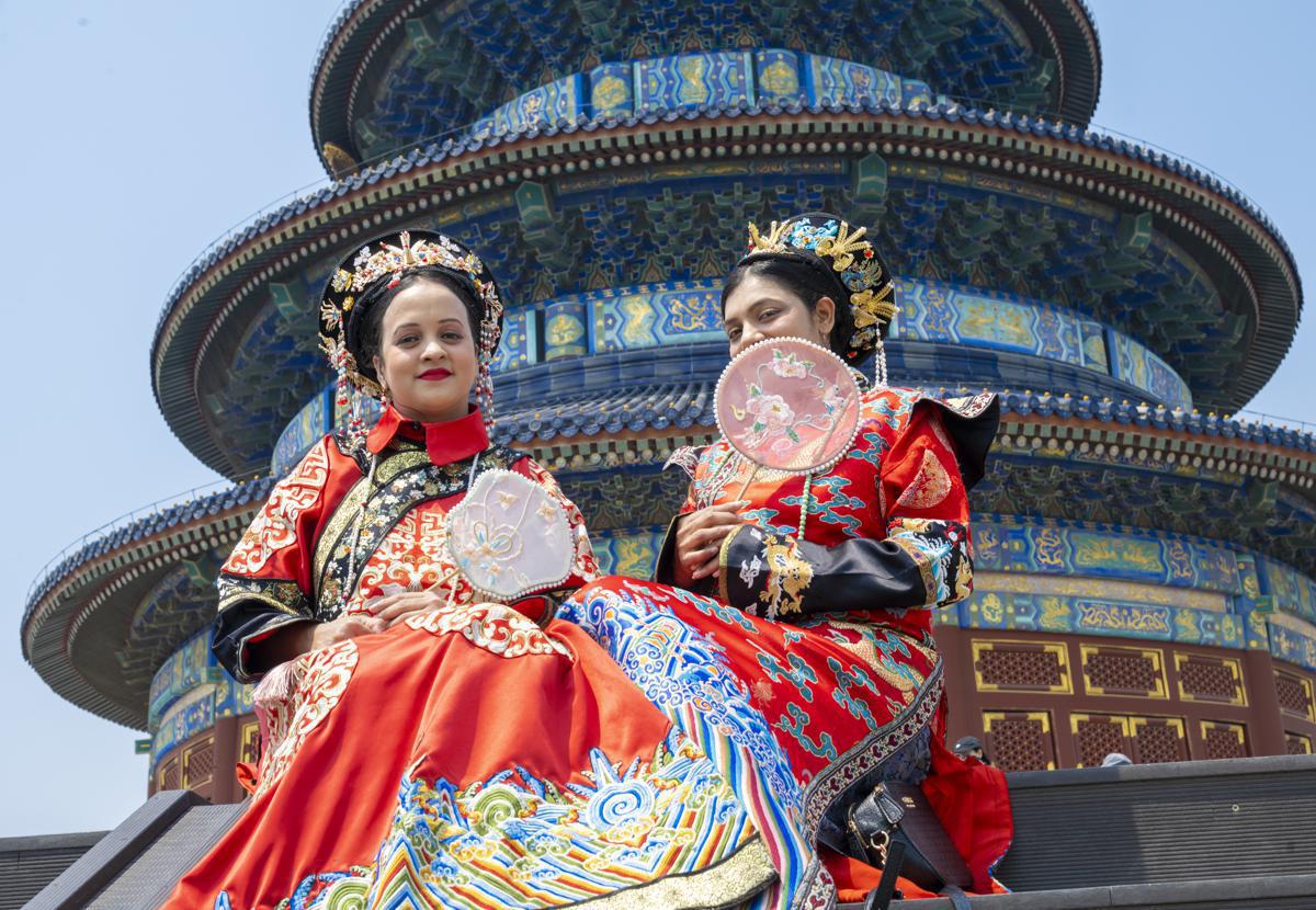 Foreign tourists wearing hanfu, or traditional Chinese attire, visit the Temple of Heaven, a UNESCO World Heritage site, in Beijing’s Dongcheng district on May 29. CHEN QIANG / FOR CHINA DAILY