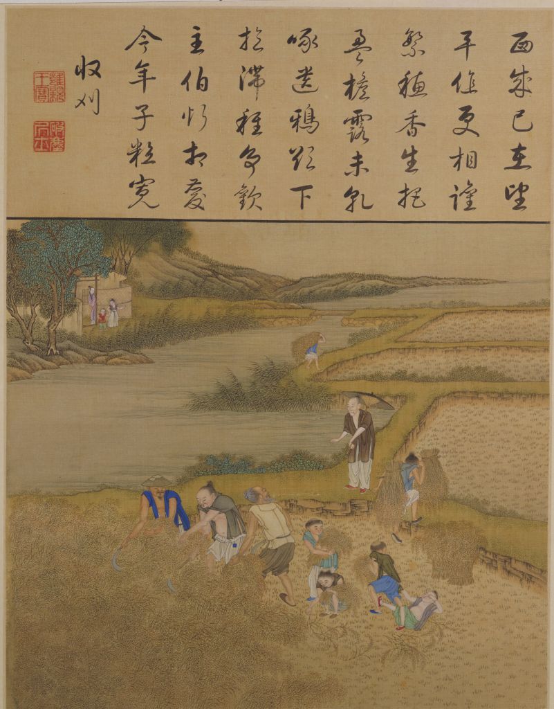 Yinzhen Plowing and Weaving Album: Harvest Scene, ink and color on silk, Qing Dynasty, from the collection of the Palace Museum [Photo/Palace Museum official website]