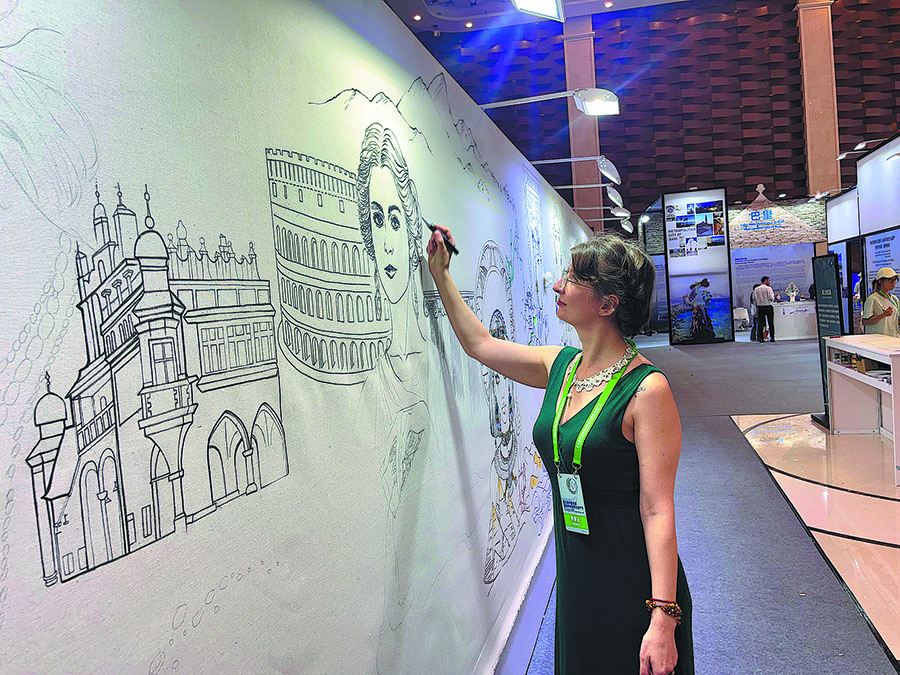 Iwona Tamborska from Poland works on a painting featuring women from Silk Road countries at the festival. [PHOTO BY YANG FEIYUE/CHINA DAILY]