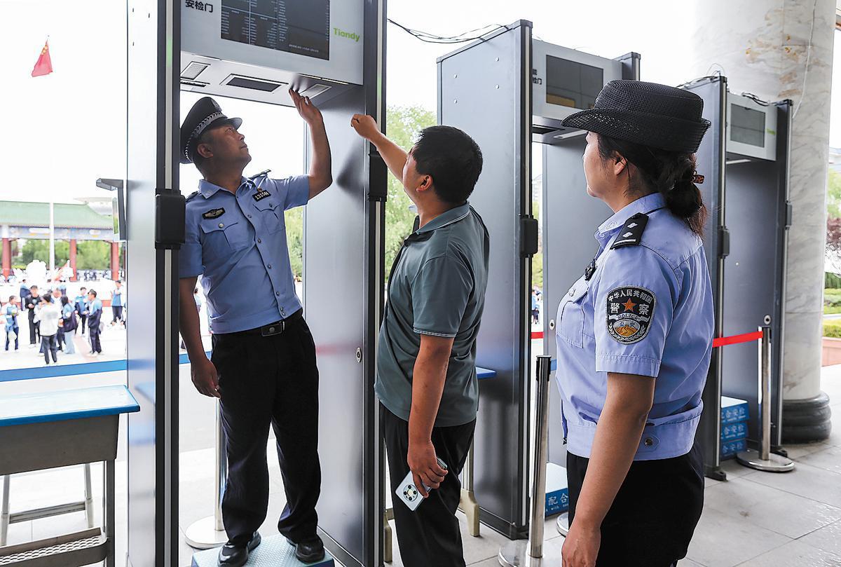 Police officers inspect an intelligent security gate at an exam site in Pingliang, Gansu province, on Wednesday. The police conducted a comprehensive safety check of the local venues for gaokao to ensure a secure and stable environment for the test-takers. ZHENG BING/FOR CHINA DAILY