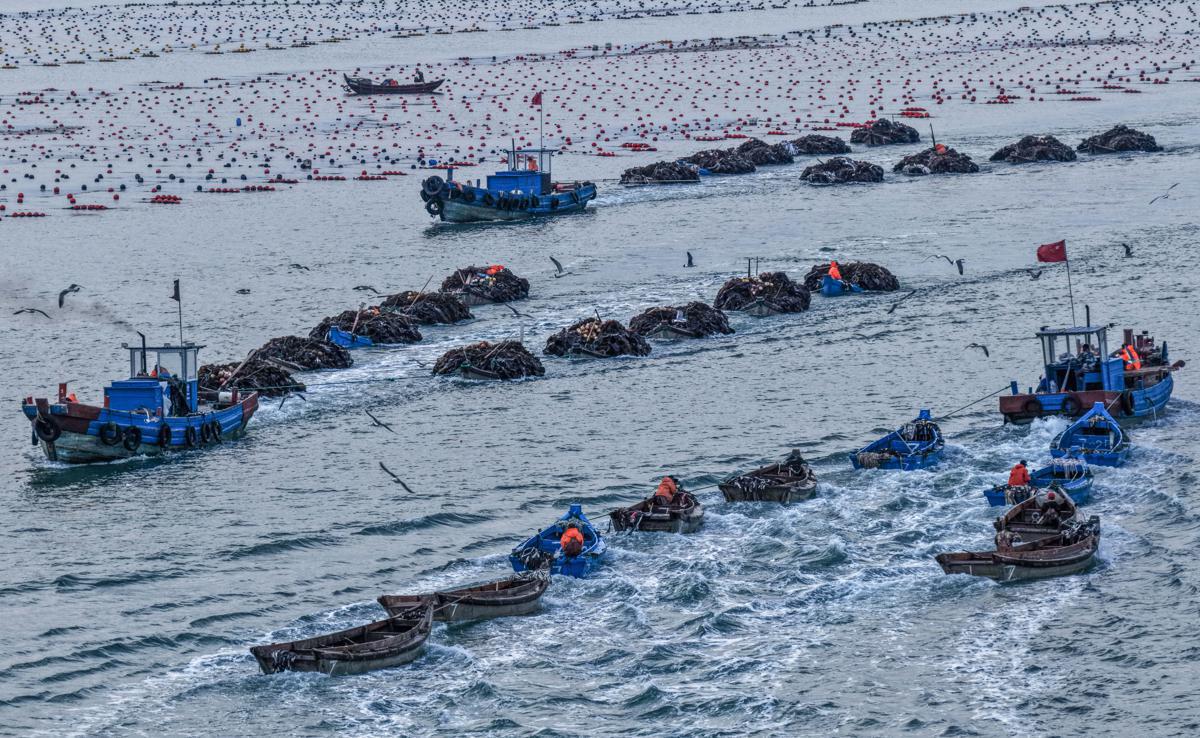 Fishermen harvest seaweed from thriving aquaculture zones on Friday in Ailun Bay, Rongcheng, Shandong province. [Photo by Li Xinjun/For chinadaily.com.cn]