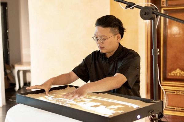 A man performs sand painting at the event. [Photo/WeChat account: sddswlpd]