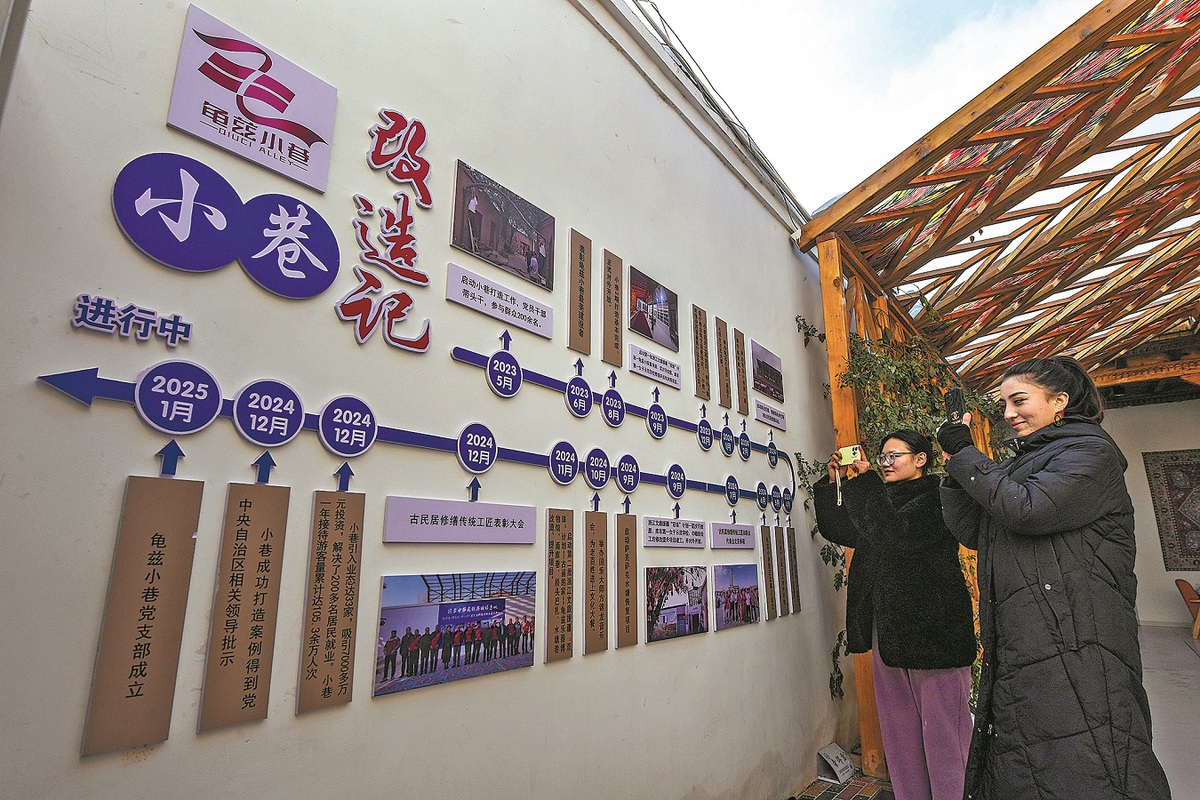 Visitors take photos of a wall displaying grassroots governance in the alley. ZHOU PENG/FOR CHINA DAILY