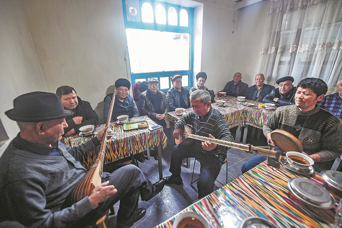 Local residents gather at Abudulkadeer Memetmin's teahouse in the alley to play instruments. ZHOU PENG/FOR CHINA DAILY