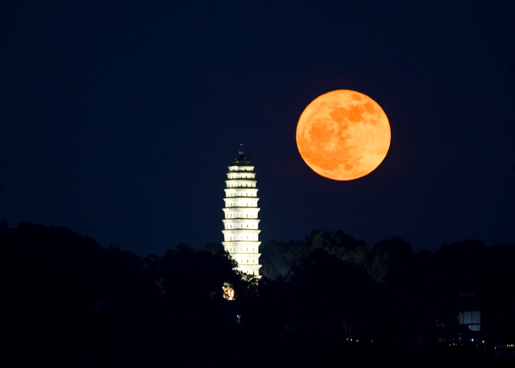 Spectacular super blood moon passes by the white pagoda in Sichuan