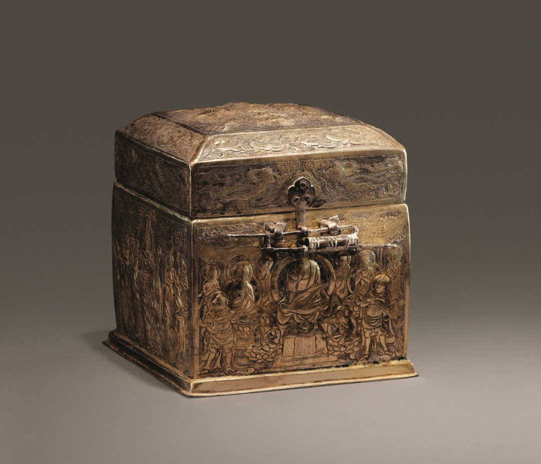 Gilt silver casket with an even roof-shaped lid and motifs depicting the Buddha preaching, from the collection of Famen Temple Museum [Photo/Famen Temple Museum official WeChat account]