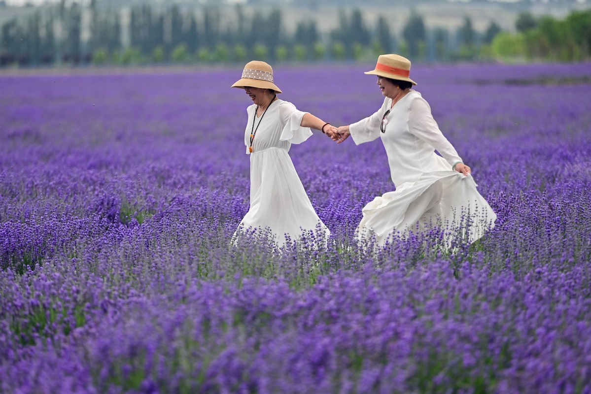 Tourists visit a lavender farm in Huocheng county, Northwest China's Xinjiang Uygur autonomous region, June 14, 2025. Vast fields of lavender in Huocheng county entered full bloom in June, transforming the landscape into a sea of purple. [Photo/Xinhua]
