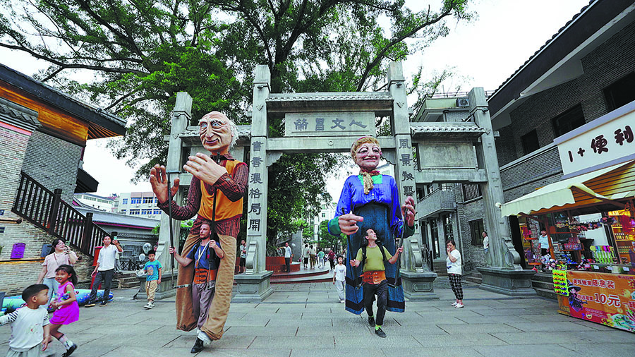 French theater troupe Les Grandes Personnes performs Nos Vieux Amants in Huichang, with its towering characters parading through the village. [Photo provided to China Daily]