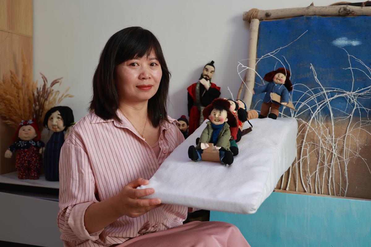 Wang Ju shows the Xiusu Bu'ou dolls she made. [Photo provided to chinadaily.com.cn]