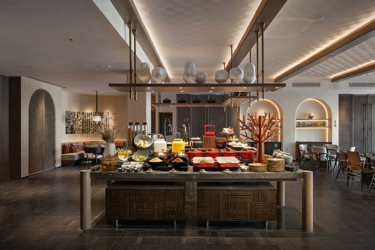 The hotel's restaurants explore regional flavors with creativity and depth. At Essence Savorium, guests can start the day with a traditional bowl of Cynomorium songaricum porridge. Zhen Chinese Restaurant reinterprets ancient court cuisine while Above Consciousness bar offers molecular cocktails inspired by the pigments of cave murals. The Silk Road Blossoms Veil tea lounge pairs artisan pastries with local Apocynum tea for an immersive cultural tasting.