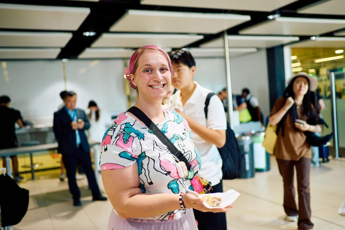 A passenger smiles to the camera during the inauguration ceremony for the JD484 London Gatwick-Qingdao route at London Gatwick Airport on Saturday. [Photo provided to chinadaily.com.cn]
