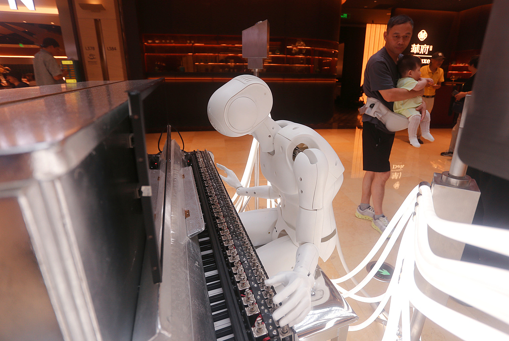 An AI pianist performs at a shopping mall in Shanghai on June 29. [Photo/VCG]