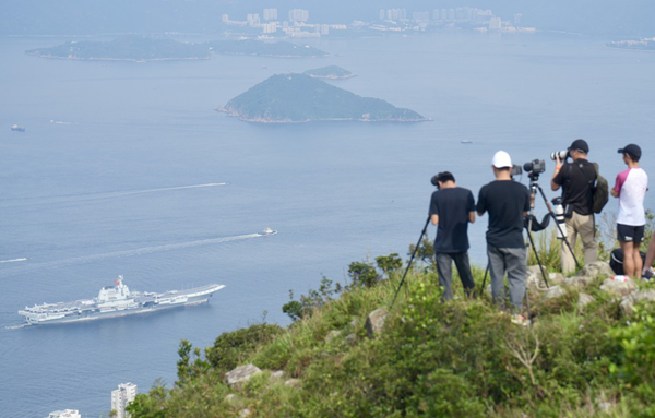 Hong Kong residents and military enthusiasts gather at High West Viewing Point on Thursday morning to photograph the the CNS Shandong. [Photo by Adam Lam/China Daily]