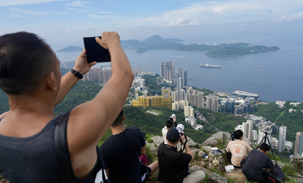 Hong Kong residents and military enthusiasts gather at High West Viewing Point on Thursday morning to photograph the CNS Shandong. [Photo by Adam Lam/China Daily]