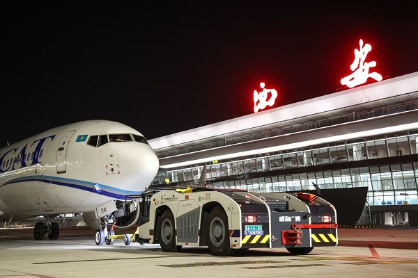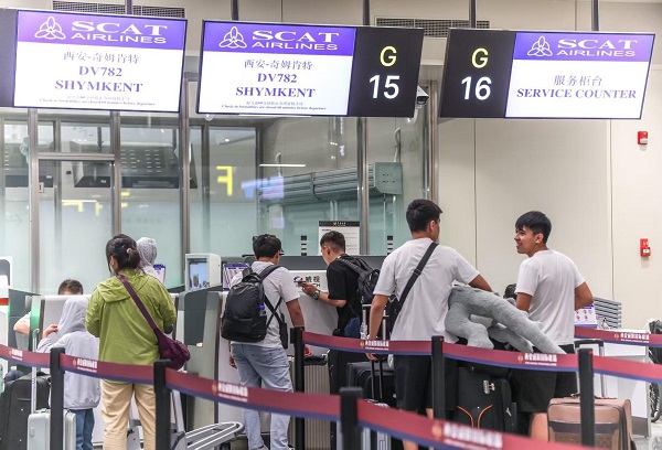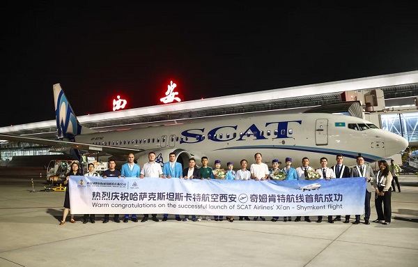 A SCAT Airlines flight bound for Shymkent, Kazakhstan, departed from Xi'an Xianyang International Airport on July 3, making Xi'an the first city in China to achieve navigation to eight cities in five Central Asian countries.