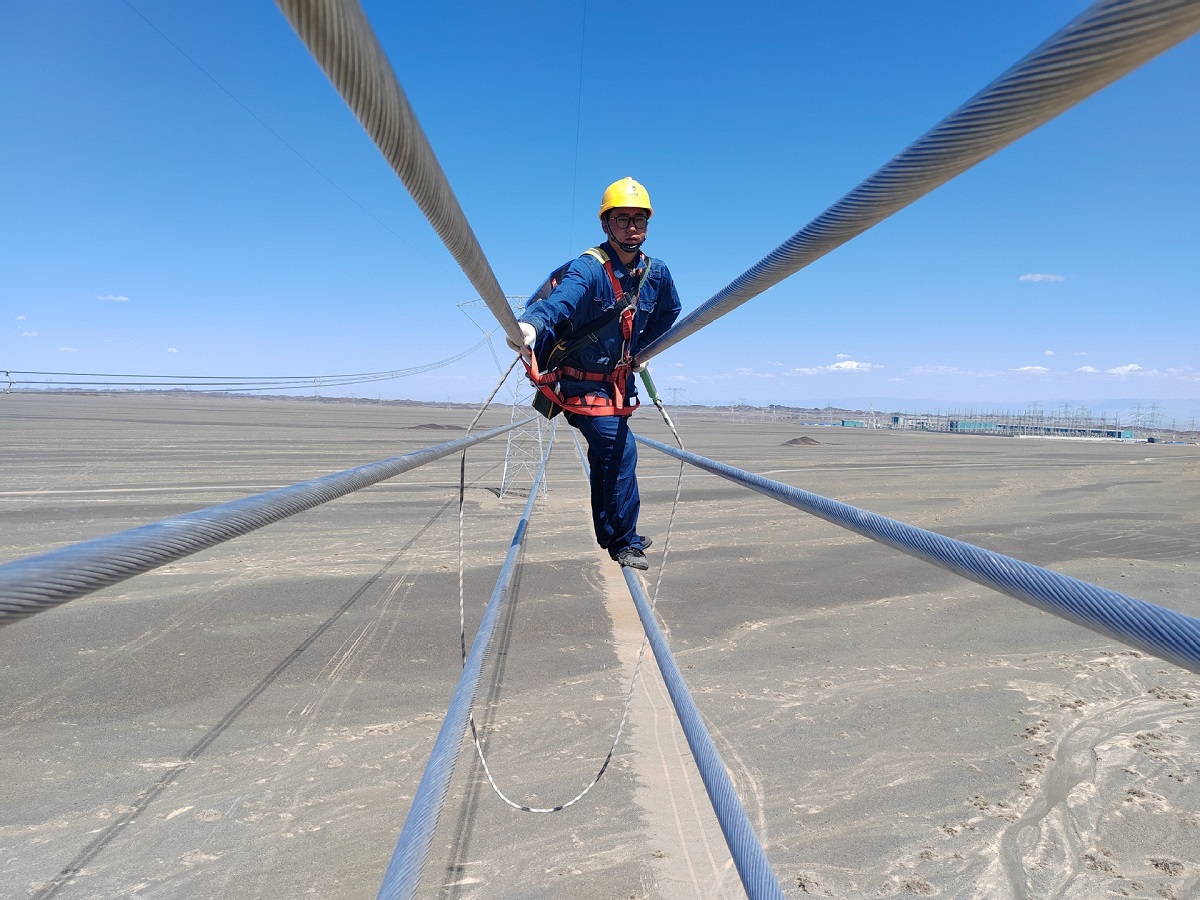 A staff member checks the cables of the Hami-Chongqing ±800 kV ultra-high voltage direct current power transmission project in Northwest China's Xinjiang Uygur autonomous region, June 19, 2025. [Photo/Xinhua]