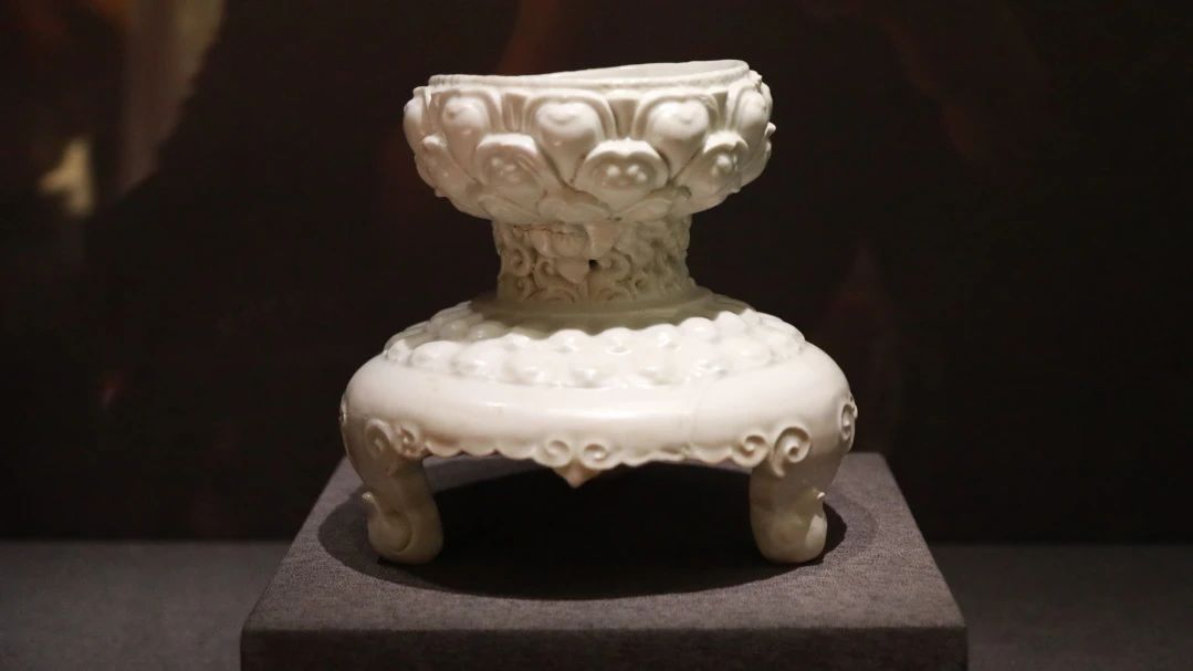 White-glazed slim-waisted three-footed pedestal embossed with lotus petal motifs, Ming Dynasty (1368-1644), from the collection of the Jingdezhen Imperial Kiln Museum [Photo/China Maritime Museum official WeChat account]