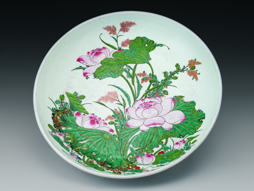 This delicate famille-rose plate dates back to the second year of the Yongzheng reign (1724) in the Qing Dynasty (1644-1911). Its pure white glaze is adorned with lotus flowers and emerald green leaves dancing in the breeze — a glimpse of summer scenery.
