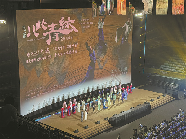 The cast and crew of the film A Tapestry of a Legendary Land at the temporary cinema set up inside Peking University's sports complex.[Photo provided to China Daily]