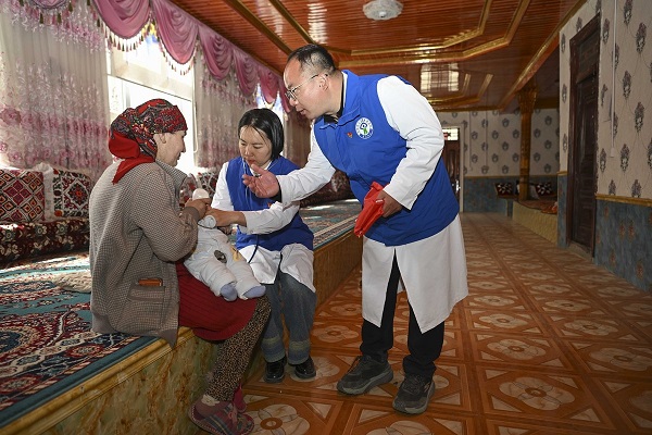 Medical workers from Shenzhen, South China's Guangdong province, conduct a health check-up for a newborn baby at a villager's home, in Tashikurgan Tajik autonomous county, Xinjiang Uygur autonomous region, March 24, 2025. [Photo/Xinhua]