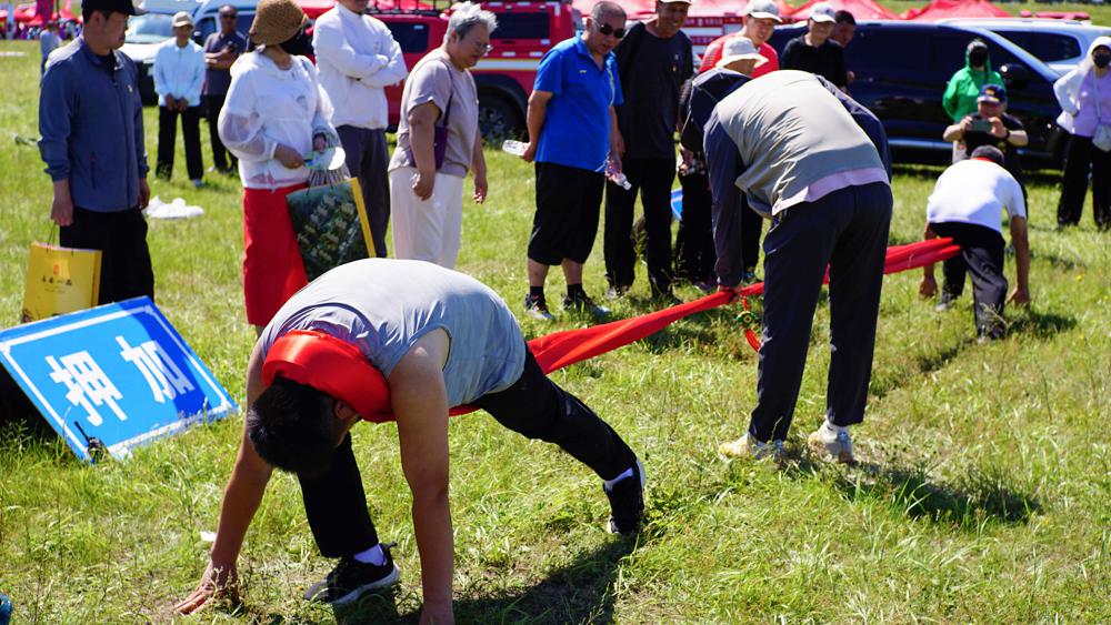 Participants compete in a traditional tug-of-war match at the 10th Kumule Festival on Sunday. [Photo by Yan Xinyao/For chinadaily.com.cn]