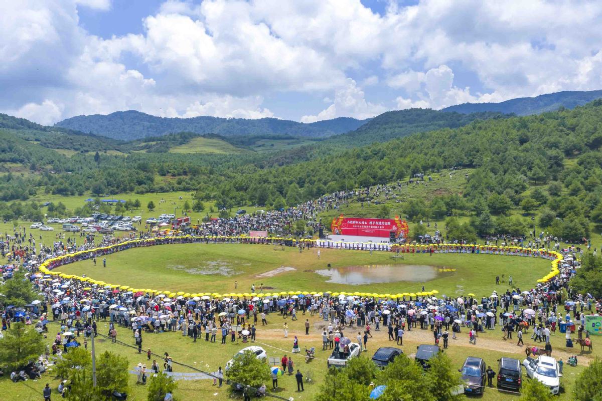 One thousand women from Yi and other ethnic groups perform Duoluohe (a traditional song-and-dance performance) during the 2025 Yanbian Ethnic Torch Festival in Yanbian county, Sichuan province, on Wednesday. [Photo by Wang Dong / For chinadaily.com.cn]