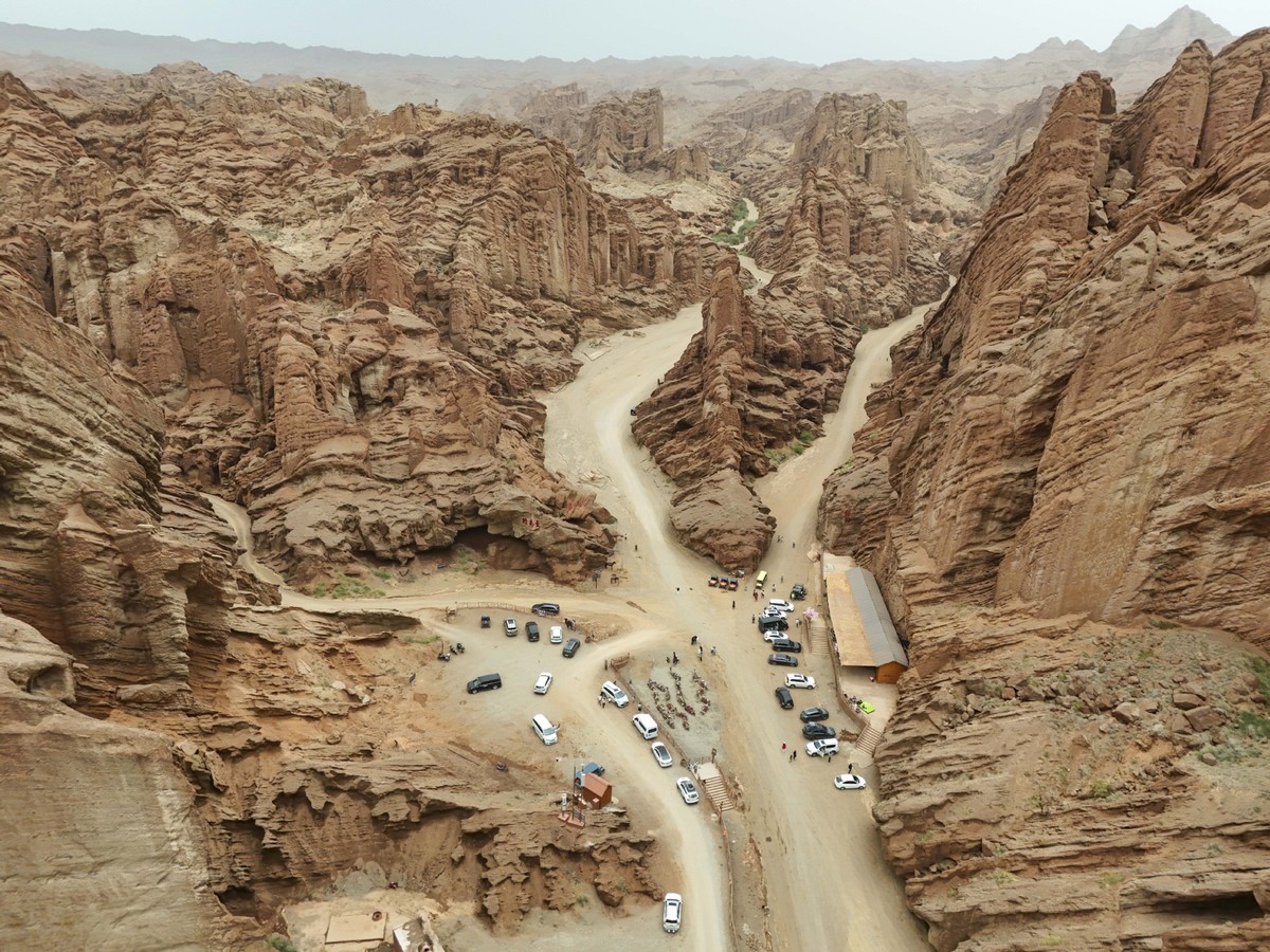 This aerial drone photo shows tourists visiting a canyon near the Duku Highway in Northwest China's Xinjiang Uygur autonomous region, July 17, 2025. [Photo/Xinhua]