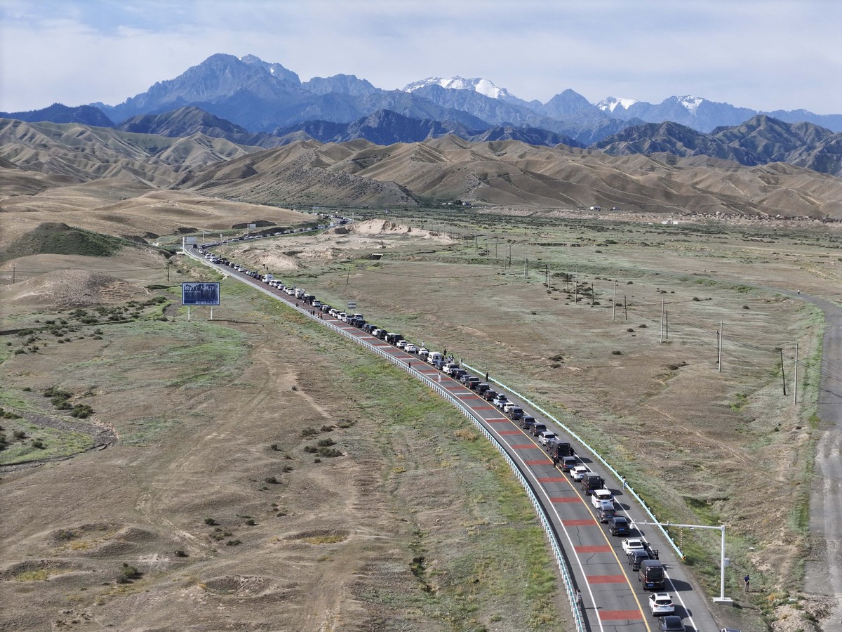An aerial drone photo shows vehicles on the Duku Highway in Northwest China's Xinjiang Uygur autonomous region, July 15, 2025. [Photo/Xinhua]