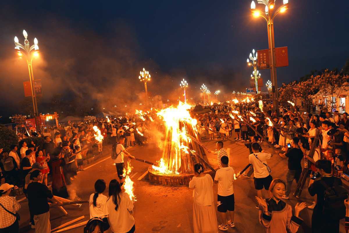 People light their torches from a bonfire on Hangtian Avenue in Xichang, Liangshan Yi autonomous prefecture, Sichuan province, to celebrate the annual Liangshan Yi Torch Festival, on Friday night. [Photo provided to chinadaily.com.cn]