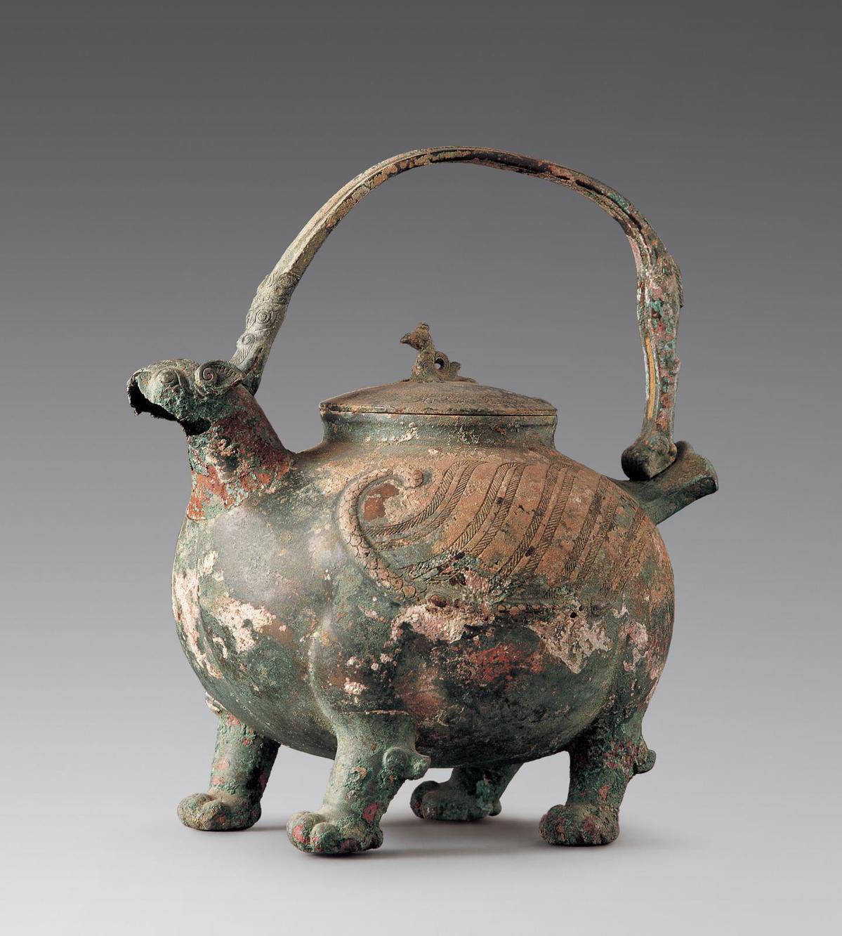 This loop-handled bronze he (liquid container), dating back to the Spring and Autumn Period (770-476 BC), is designed with a deep round belly and four sturdy legs. It resembles a beast blending mythical creatures from both Chinese and Western traditions—a White Tiger as the spout, a Vermilion Bird atop the lid, and Azure Dragons around the body’s sides, each with five wings, recalling the griffin of Western mythology.