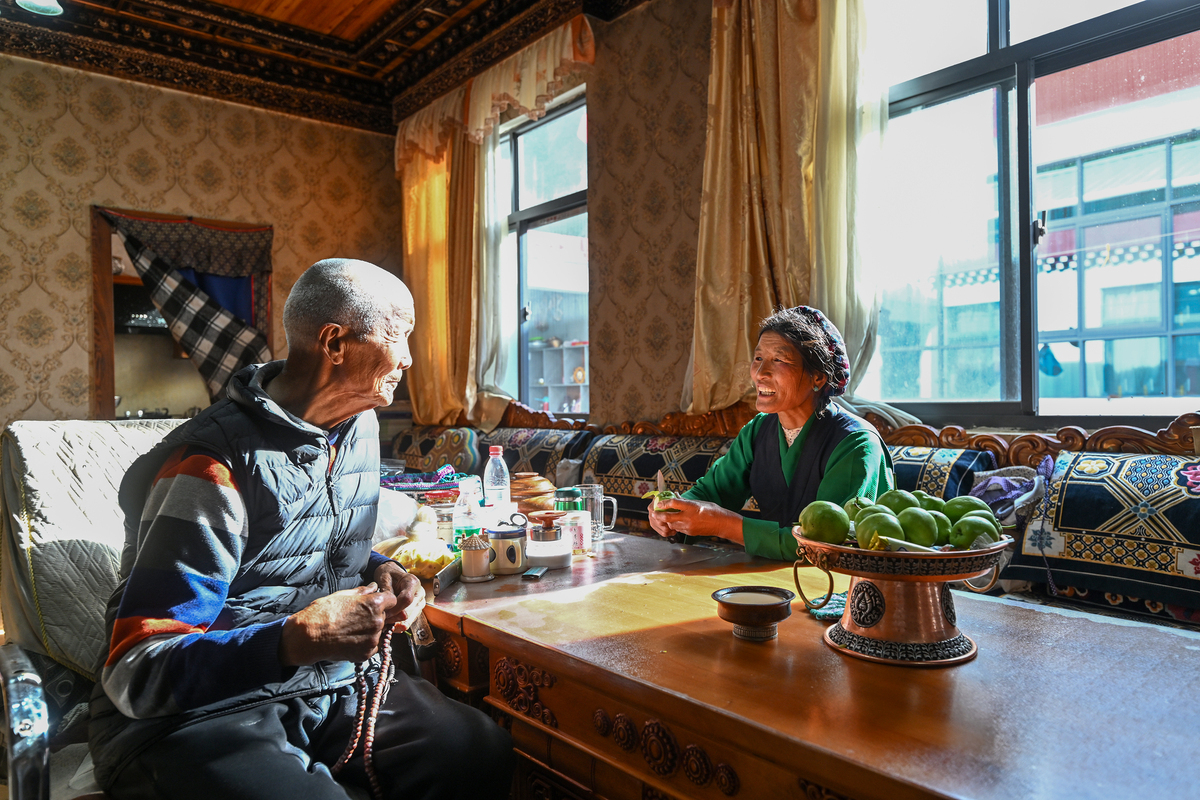 Gesang Deqing (R) peels a fruit for her father at the dining room of their new house in Lnadingxooi village, Zhomda township, Nang county of Southwest China's Xizang autonomous region, July 21, 2025. [Photo/Xinhua]