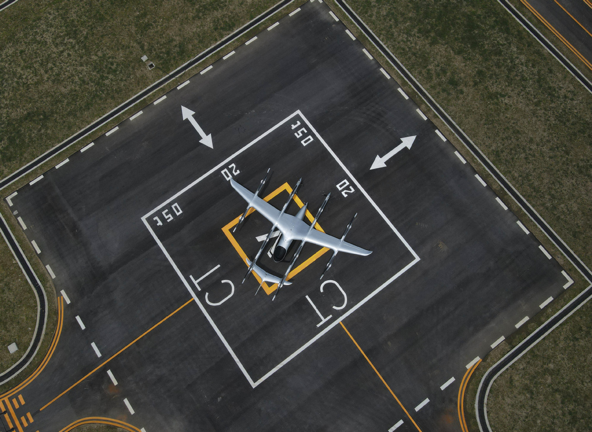 An aerial drone photo taken on July 22, 2025 shows the V2000CG CarryAll, a ton-class electric vertical takeoff and landing (eVTOL) aircraft on the apron in Kunshan, East China's Jiangsu province. [Photo/Xinhua]