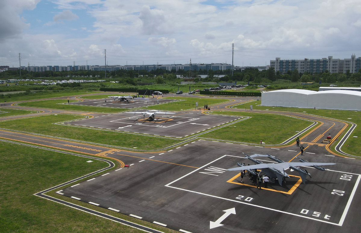 An aerial drone photo taken on July 22, 2025 shows a flight test base for the V2000CG CarryAll, a ton-class electric vertical takeoff and landing (eVTOL) aircraft in Kunshan, East China's Jiangsu province. [Photo/Xinhua]