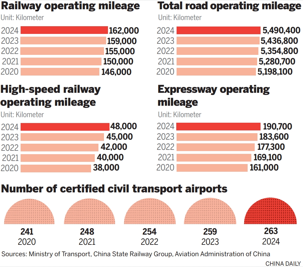 From 2021 to 2024, China's total operational length of railway lines reached 162,000 kilometers, an increase of 16,000 km from 2020, including 10,000 km of new high-speed rail. Total road length expanded in that period to 5.49 million km, up by around 290,000 km, with expressways alone growing by around 30,000 km to 190,700 km.