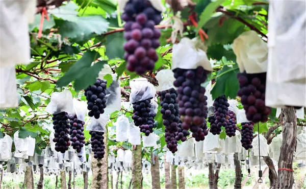 In Dongdai town, the star attraction is the exquisite "Jumeigui" grape at Guantou Yinggui Family Farm. These seedless grapes, known for their juicy texture and exceptional sweetness, thrive in the region's mineral-rich soil and abundant sunshine.