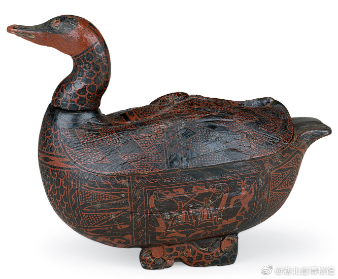This intricately carved mandarin duck is a rare lacquerware unearthed from the tomb of Marquis Yi of the Zeng State of the Warring States Period (475-221 BC). It has a hollow body, a lid on its back, and a movable head. On its sides, you can find lively paintings of mythical beasts striking bells, drums, and dancing.