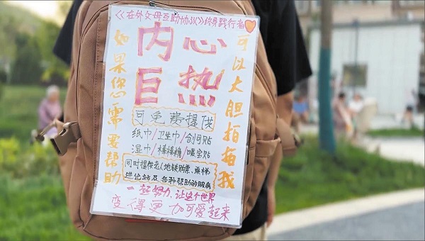 "If you need help, just pat me." These words, printed on a red card clipped to Zhao Chen's backpack, have become a signal of care across the crowded subway stations and bustling sidewalks in Xi'an, Shaanxi province.