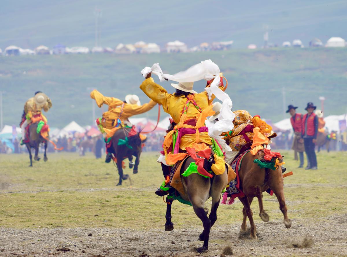 Tibetan herdsmen perform traditional equestrian stunts at a horse racing festival in Litang county, Sichuan province, on Wednesday. [Photo provided to chinadaily.com.cn]