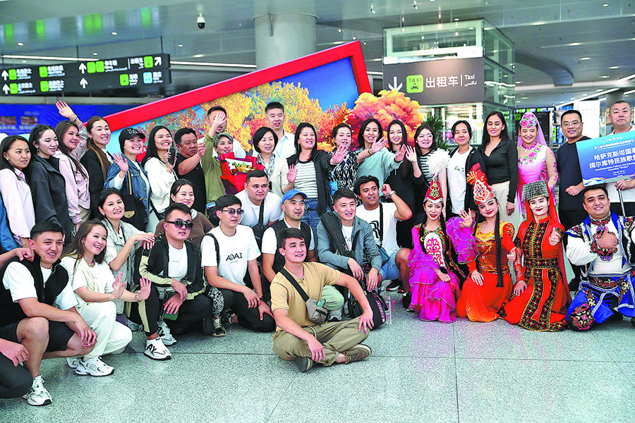 Members from a Kazakhstan song and dance ensemble pose for a group photo with Chinese dancers upon their arrival in Urumqi. [PHOTO BY ZOU HONG/CHINA DAILY]