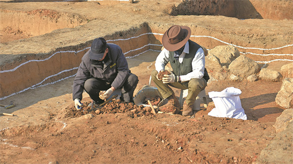Archaeologists clean and excavate the remains at the Panlongcheng site. [Photo provided to China Daily]