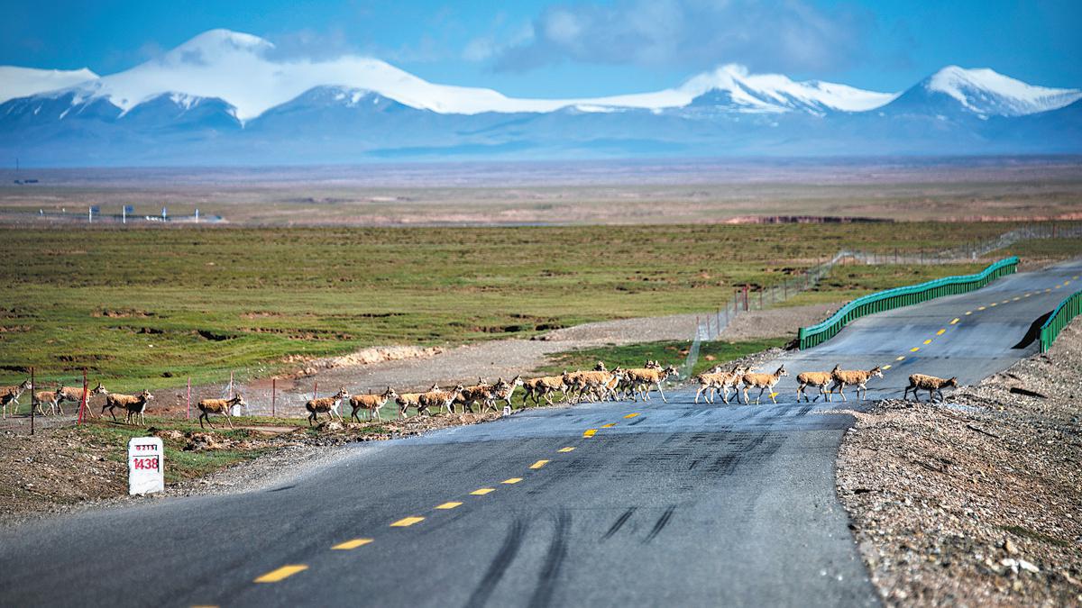 XINING — In the early summer, drivers on a stretch of National Highway 109 in the Yushu Tibetan autonomous prefecture of Northwest China's Qinghai province often encounter a unique spectacle: herds of Tibetan antelopes crossing the busy road.